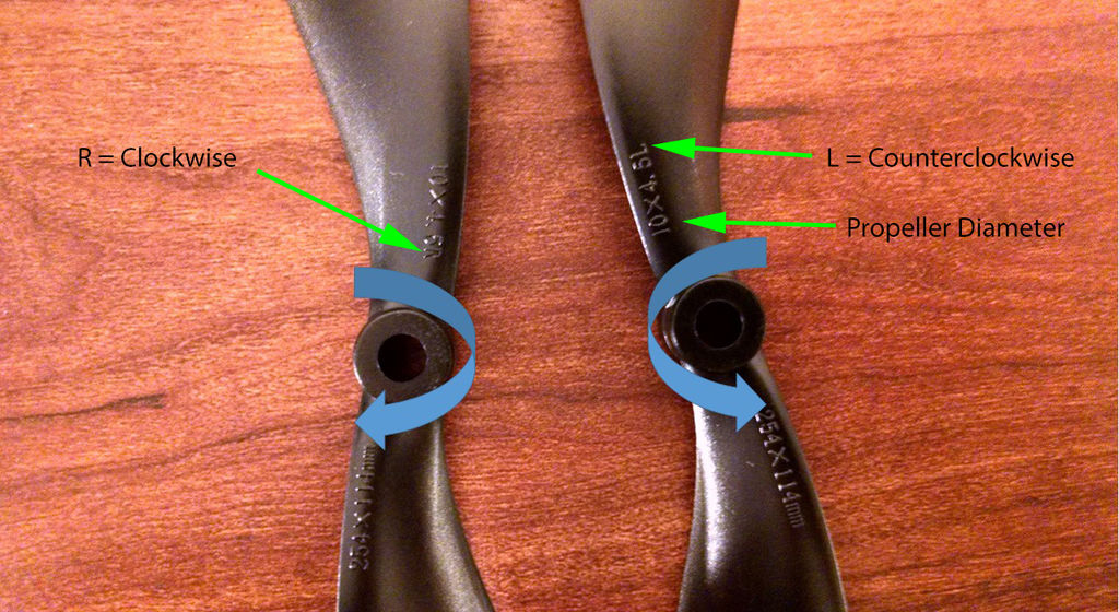 - Quando utilizar motores com mais alta capacidade de rotações (RPM’s), optar por hélices menores ou de tamanho médio. Quando utilizar motores de baixa taxa de RPM, optar por hélices maiores, ou poderá haver problemas em manter o veículo no ar em baixas velocidades.