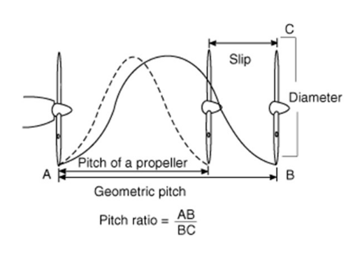 O modelo EPP1045, por exemplo, indica que a hélice possui um diâmetro de 10″ e tem um passo de 4.5″. Este segundo valor indica que, se essa hélice der uma volta completa, horizontalmente (como na figura acima), ela terá se deslocado 4.5″. Parte da energia fornecida à hélice pelo motor é “perdida”, portanto, existe um passo teórico (ou geométrico, que é a distância teórica que a hélice deveria percorrer) e um passo efetivo (que é a distância real percorrida por uma revolução da hélice). A diferença entre o passo teórico e o passo efetivo é denominada recuo (slip).